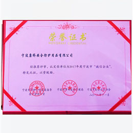 2018年經(jīng)寧波市北侖區(qū)市場(chǎng)監(jiān)督管理局推薦,被寧波市精神文明建設(shè)指導(dǎo)委員會(huì)、寧波市市場(chǎng)監(jiān)督管理局、寧波市民營(yíng)企業(yè)協(xié)會(huì)聯(lián)合評(píng)選認(rèn)定為寧波市誠(chéng)信民營(yíng)企業(yè)稱(chēng)號(hào)。2020年被寧波市北侖區(qū)市場(chǎng)監(jiān)督管理局授予浙江省A級(jí)守合同重信用企業(yè)。2022年經(jīng)寧波市北侖區(qū)市場(chǎng)監(jiān)督管理局推薦,被寧波市市場(chǎng)監(jiān)督管理局授予浙江省AA級(jí)守合同重信用企業(yè)。